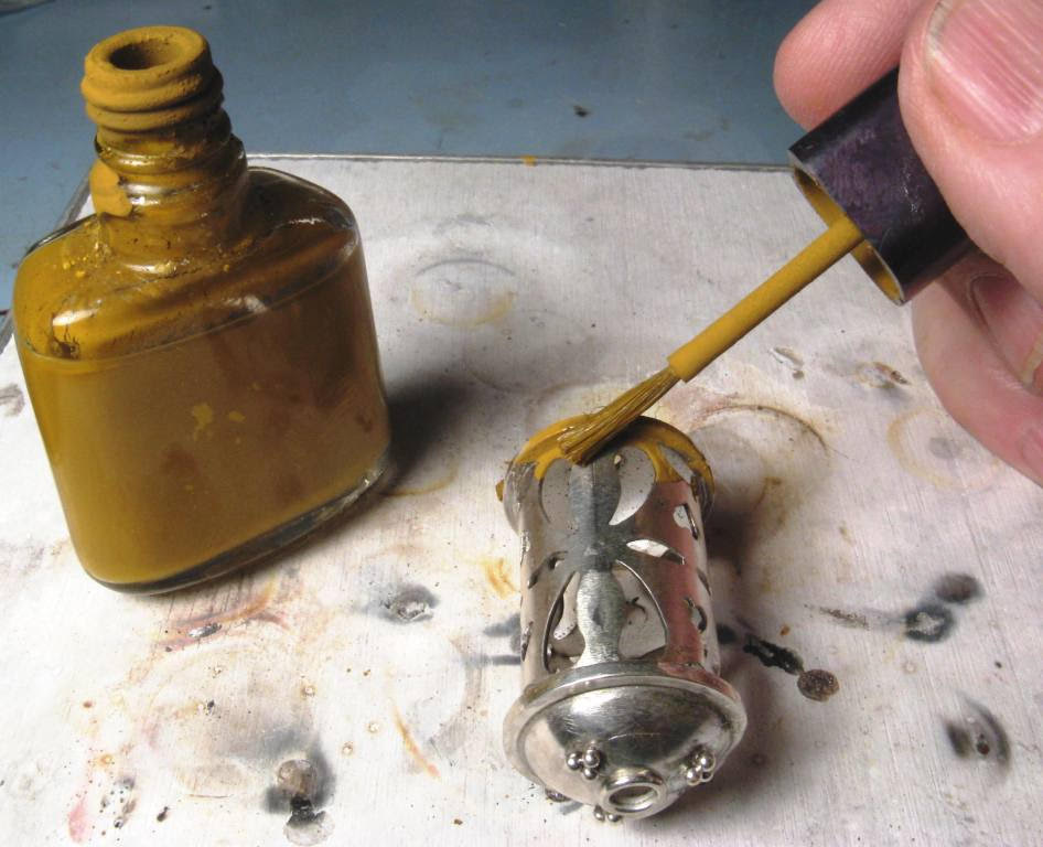 Yellow ochre is used when you want to be sure the solder won’t flow on an area of your piece while you’re soldering another area. The only problem with ochre is coming up with a good way to store and apply it.
