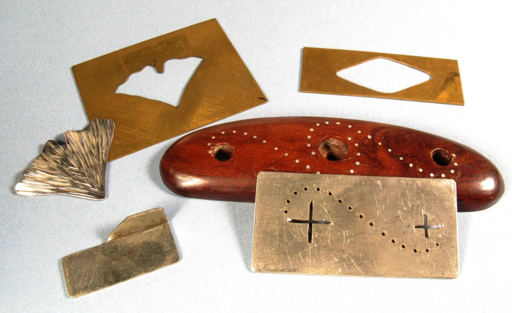 One example is the brass template in the pic below that lets me quickly trace the design of ginkgo leaf earrings onto a silver sheet. Another is the nickel template which makes it easy to drill a pattern of holes for pin inlay into wooden handles.