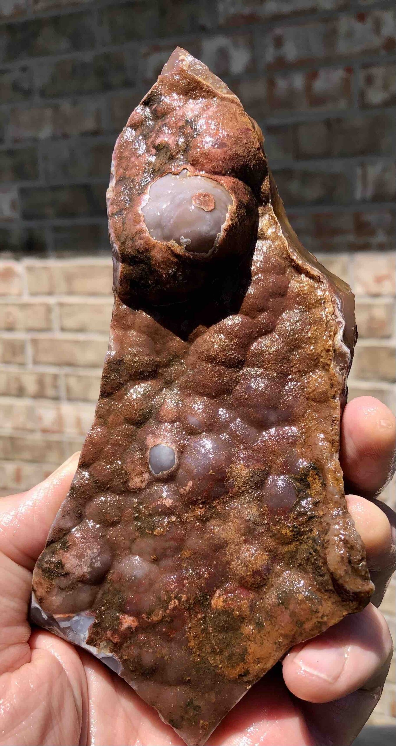 When you find a big hole it’s usually a good idea to inspect the immediate vicinity! Steve found an interesting prospect and started working on it and my daughter Jessica helped him. Paul, my grandson, began picking up pieces here and there. My granddaughter Alia helped several people, especially Aaron, with their digging and chatted with everyone about rocks and the desert, so different from the Houston area. I started looking at an area close to where someone else had excavated and spotted what looked like seam agate and started pulling pieces out. Rubbing dirt off the exposed edges revealed bright red agate with clear and lavender layers. Jackpot! Steve and Jessica soon abandoned the first piece to come down to help pull out more pieces.