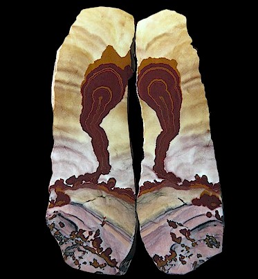 Fractures and pits can exist in these jaspers, and according to some rockhounds who have bought them online, you can expect to throw out about half of your rough as you work around flaws. Some will only buy at shows for this reason. Color is also highly variable and hard to represent accurately. In my opinion, the descriptions of jaspers from this area accord well with that story told by the Miner’s Co-op vendor who spoke of slightly different jaspers on every knob in the hills in an area of Nevada. It is only natural that the sizes of regions of desirable colors would vary widely – too widely to always get them all into one small cab! But when they’re good they’re wonderful! IF you can’t find what you want at a show, you can take a chance and buy online from a reputable dealer. In the meantime, feast your eyes on Phillip Stephenson’s collection of Dead Camel slabs displayed on his website: