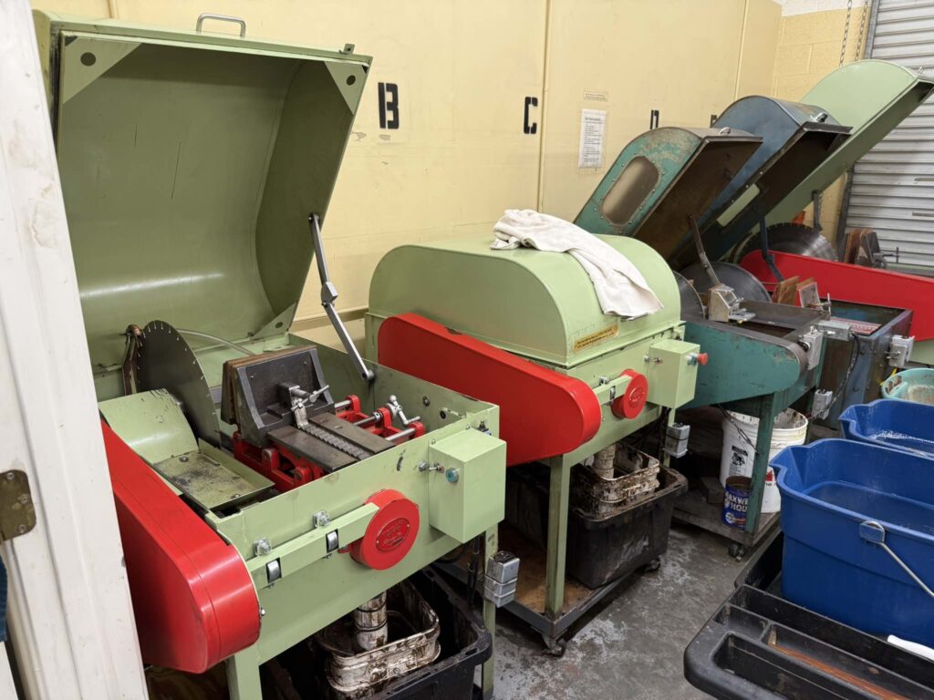 Jerry showed me their lapidary set-up, which was impressive. They have seven slab saws, with up to 24” blades. Three of them were new-looking Highland Park Lapidary saws, and they also had a drop saw, which is handy for cutting chunks, big nodules, and geodes. They have a Highland Park Lapidary 18-inch flat lap with all the plates needed for grinding and polishing. There were 6 individual 6” Cab King machines that were METERED, so that users were only charged for the time they spent on a machine. These were connected to the water line and drain, like at our shop, but they were set up low so you could sit and do your work. The angled bases were made from a white countertop material.