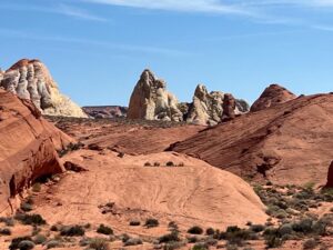 Another day, we visited Valley of Fire State Park, which is a wonderful area to explore and much less crowded than Red Rock Canyon, which is right outside Las Vegas. The red rock formations there are also Aztec Sandstone of Jurassic age. Westward-flowing rivers carried the material eroded from the Appalachian Mountains, which were once of Himalayan stature. Many of the formations within Valley of Fire State Park have curious small caves.