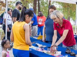 The HGMS had a booth at the Energy Day Event in Sam Houston Park in downtown Houston on Saturday, Oct 18. The HGMS booth was staffed by Sarah Metsa, Elsa Kapitan-White, and Scott Singleton. This event occurs annually and is hosted by CEEF (Consumer Energy Education Foundation). The purpose of this event is to have a family-oriented festival showcasing STEM in an engaging, outdoor environment with interactive exhibits and live demonstrations. The HGMS booth had 3 tables, each with an educational exhibit. The first was our rock type display (sedimentary, igneous, metamorphic), the second was our Mohs Hardness display, and the third was what we affectionately call our ‘pretty rock’ display. Kids who came by the booth were treated to a free piece of petrified wood.