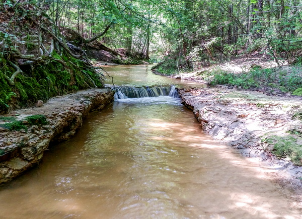 View upstream showing a waterfall formed as the stream eroded into the Catahoula Formation. In the distance the stream is following along the top of the formation.